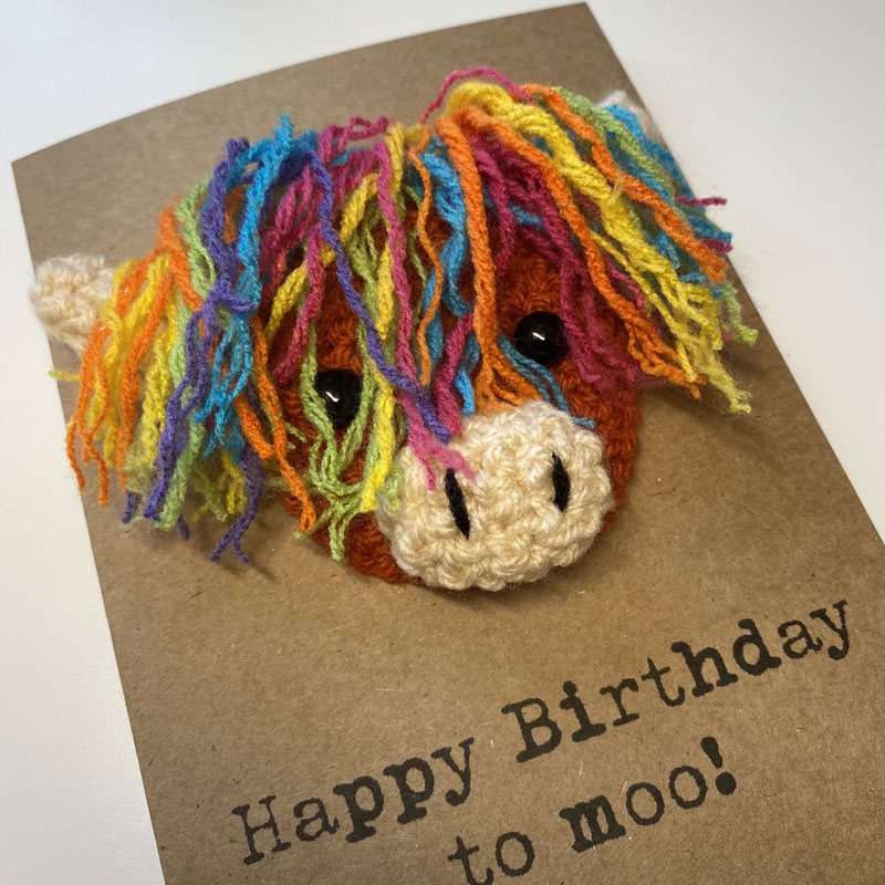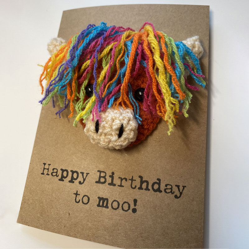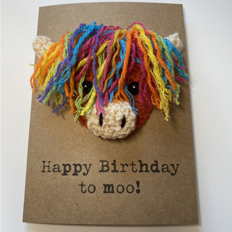 🥰Birthday card featuring a crochet ginger brown highland cow with long rainbow fringe and the wording "Happy Birthday to moo!".