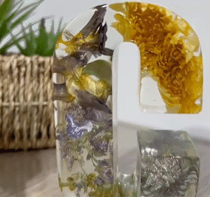 This resin flower is made from dried flowers encapsulated in crystal clear resin. This personalized alphabet design adds a touch of nature and elegance to any room, making it a perfect gift or unique decor piece.
