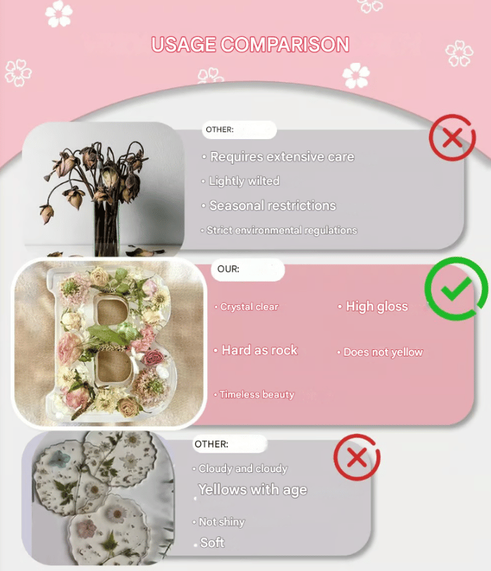Made of high quality resin, durable and long lasting. The crystal clear material ensures transparency and lets the bright colors of the dried flowers shine.
