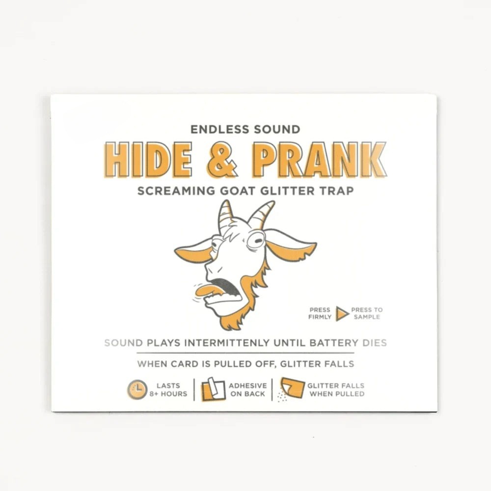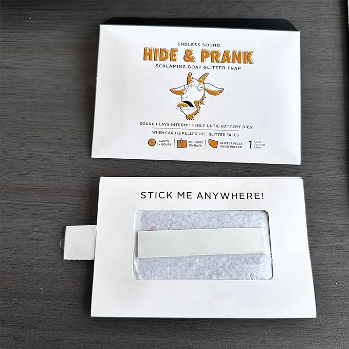 Glitter Trap: Once it's found and pulled off the wall it will break the chunky-glitter pouch on back spreading all over the ground. Plays a sporadic GOAT scream for at least 8 hours. Great for office pranks or friend's home. Like annoying hide and seek.