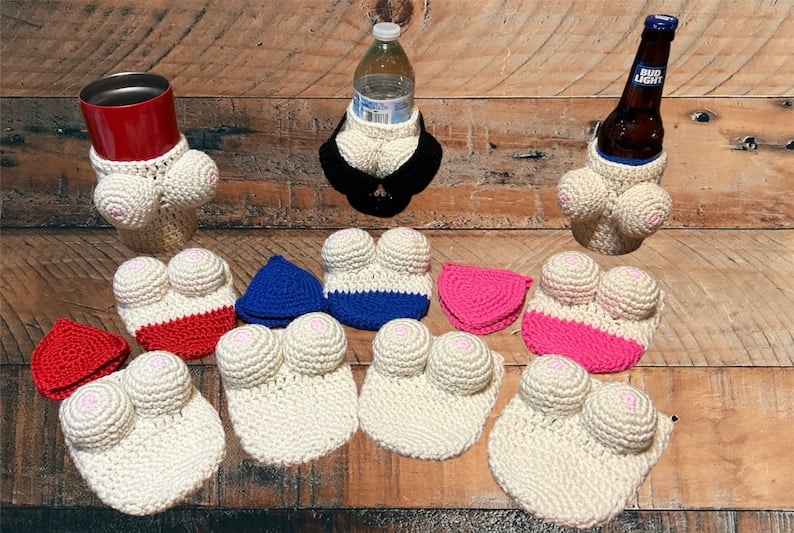 Handmade Crochet boobies Beer Cover. Awesome idea for Bachelor party, Bachelorette party, adult gag gift of just because. There will be a lot of laughs and giggles for sure!!!